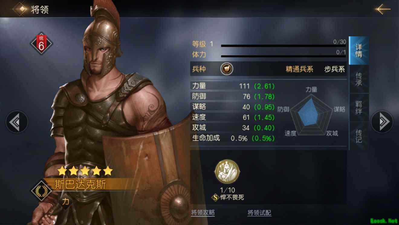 斯巴达克斯有着较高的力量属性和力量成长值,同时防御属性也比较出色,其自带技能可以依靠牺牲自身兵力来换取对敌人的高额物理伤害,该伤害可通过提高力量值从而提升伤害,自身力量属性越高,技能的伤害也就越高,斯巴达克斯还能利用自身的负面状态概率打出暴击。