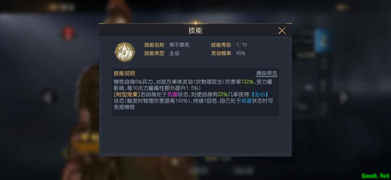 斯巴达克斯的自带技能【悍不畏死】,能够以牺牲自身5%兵力为代价,对敌方单体发动一次物理攻击,同时每10点力量属性提高1.5%的伤害率,如果自身处于负面状态,则有一定概率获得【会心】,如果自身处于【规避】状态,则可以免疫牺牲。