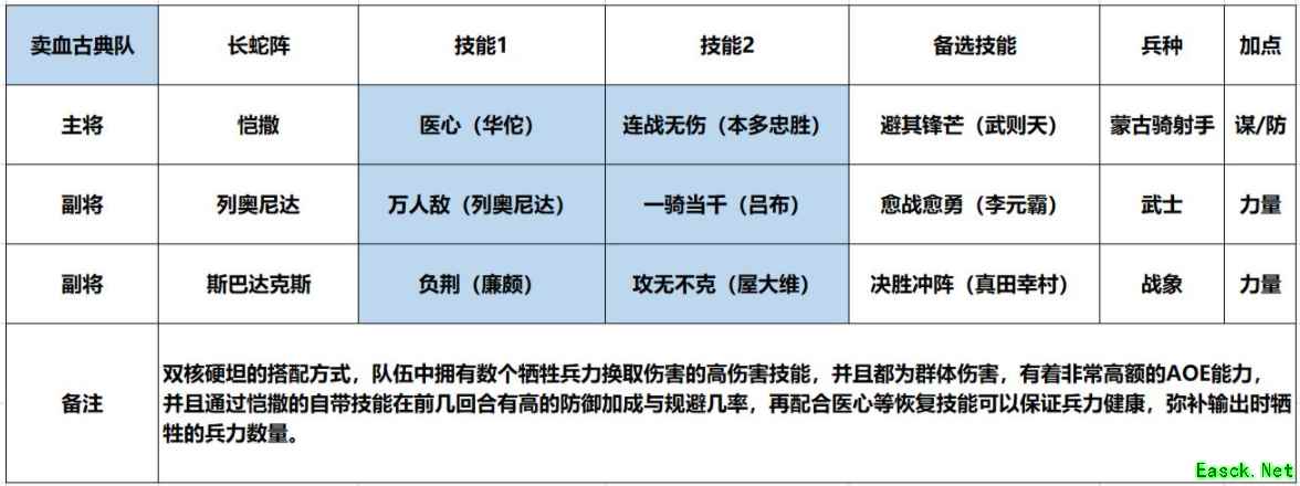 从技能描述来看,每次发动技能都会损失5%的兵力,当自身兵力较多时,这个损失还是很严重的,但随着回合数的递增,自身兵力总数也有了很大的减少,此时5%的损失就相当于被稀释了,所以斯巴达克斯并不十分依赖辅助。另外自带技能的伤害能够吃到力量属性的加成,因此建议大家在加点方面给斯巴达克斯全加力量,最大化伤害。