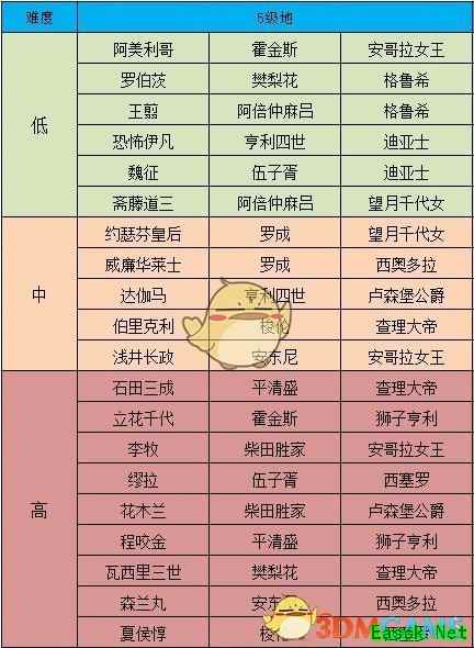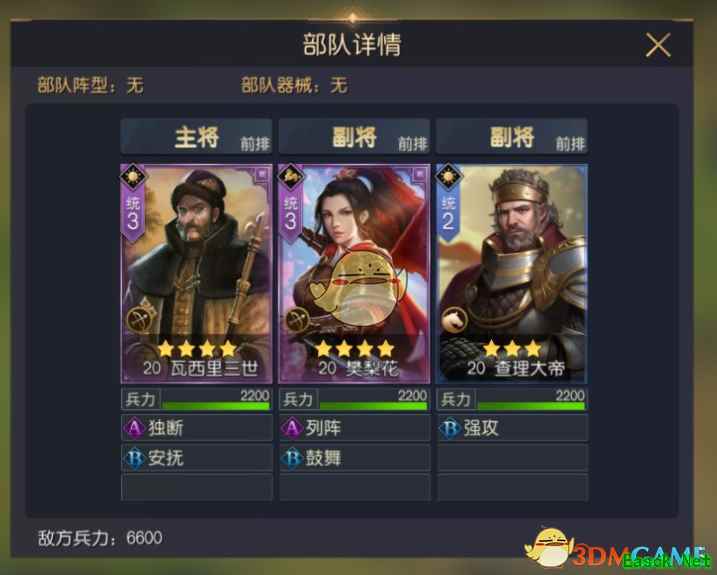 另外同样要关注不同五级地之间难度上的差异,比如,瓦西里三世+樊梨花+查理大帝的组合,就同时拥有【缴械】控制效果,同时还有减伤效果,建议在刚开五级地的时候小伙伴们可以相对避开他,避免大兵损甚至翻车。