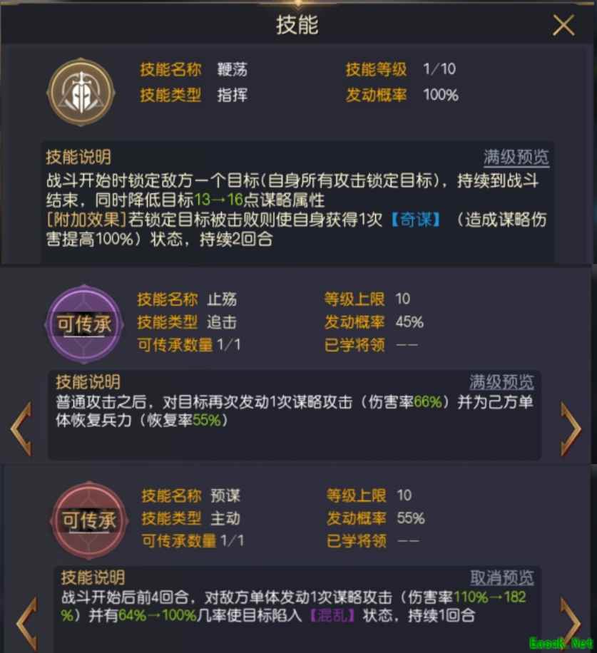 伍子胥的三技能推荐使用【预谋】,技能效果为:战斗开始后前四回合,对敌方单体发动一次谋略攻击,伤害率为110%,满级可以达到182%。并且有64%的几率使目标陷入逃兵状态,满级概率为100%。这使得伍子胥的单体伤害非常高,可以迅速击败锁定目标,打出【奇谋】效果,增加后续爆发伤害。