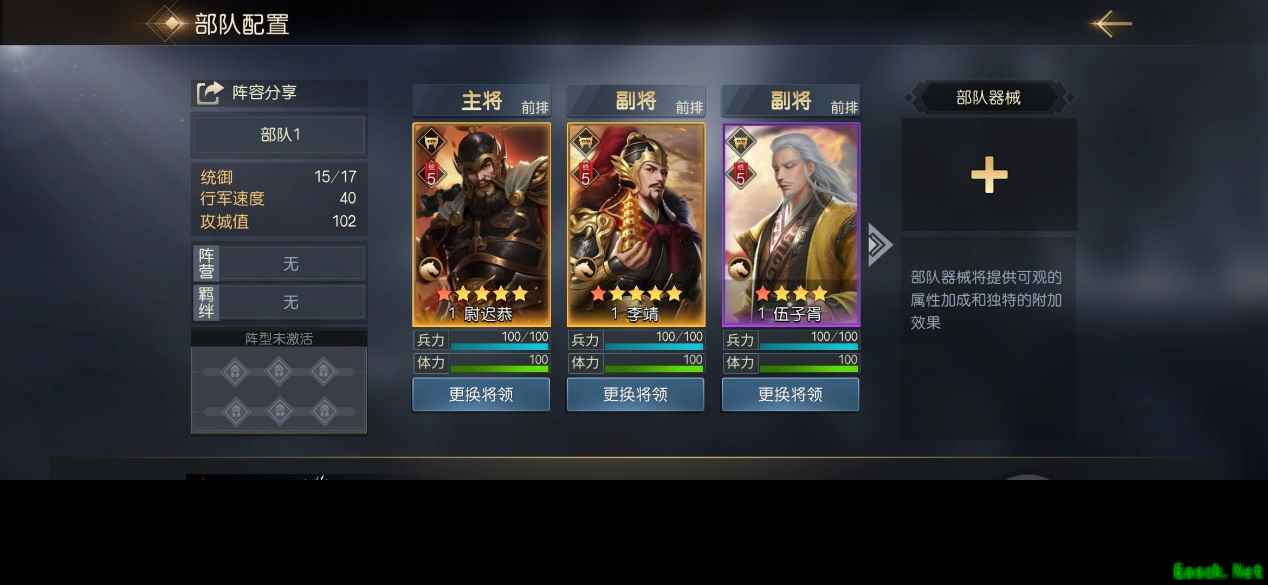 这套阵容是尉迟恭作为主将,李靖、伍子胥为副将。这三个将领都是骑兵兵种,依靠高额的技能输出,再搭配上追击技能以及控制效果,增益己方的同时,削弱了敌方的伤害,既有物理攻击,又搭配了谋略伤害,可以说是非常全面。。