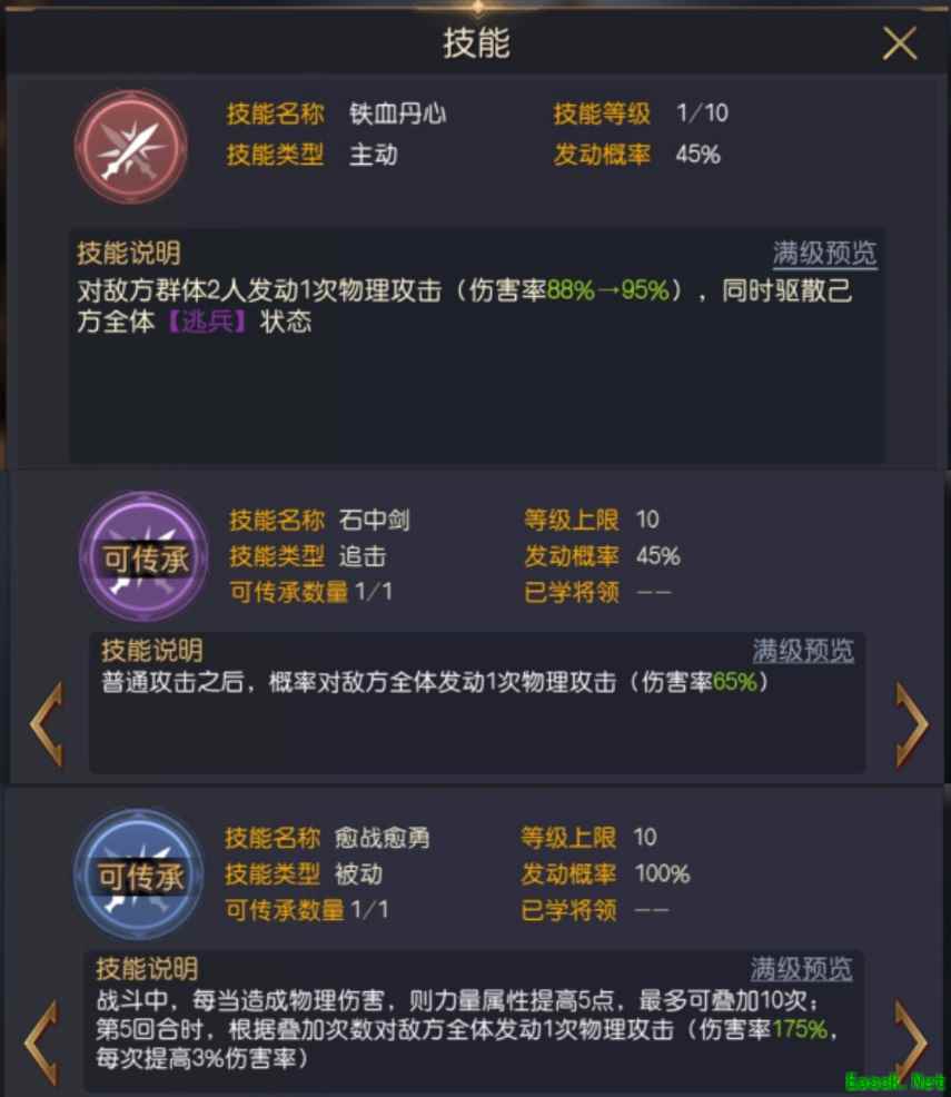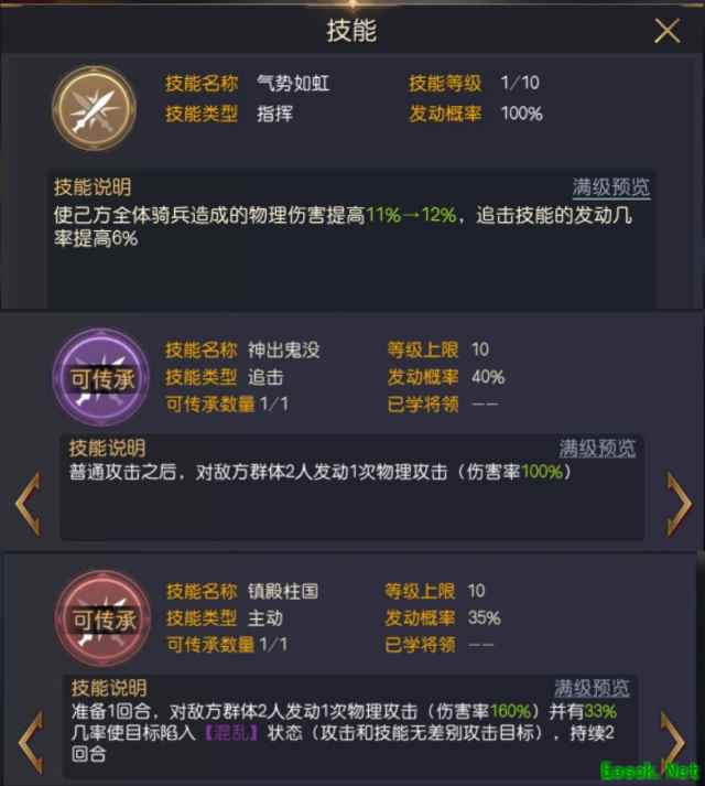 这套阵容主要优势是伤害高,而且追击技能多,在每一次普通攻击后,都有几率触发追击技能,增益己方的同时,又可以削弱敌方战力,整体上可以说是十分全面。不过因为三个将领都是骑兵兵种,容易被弓兵克制,小伙伴们在战斗前一定要侦查敌方的兵种。