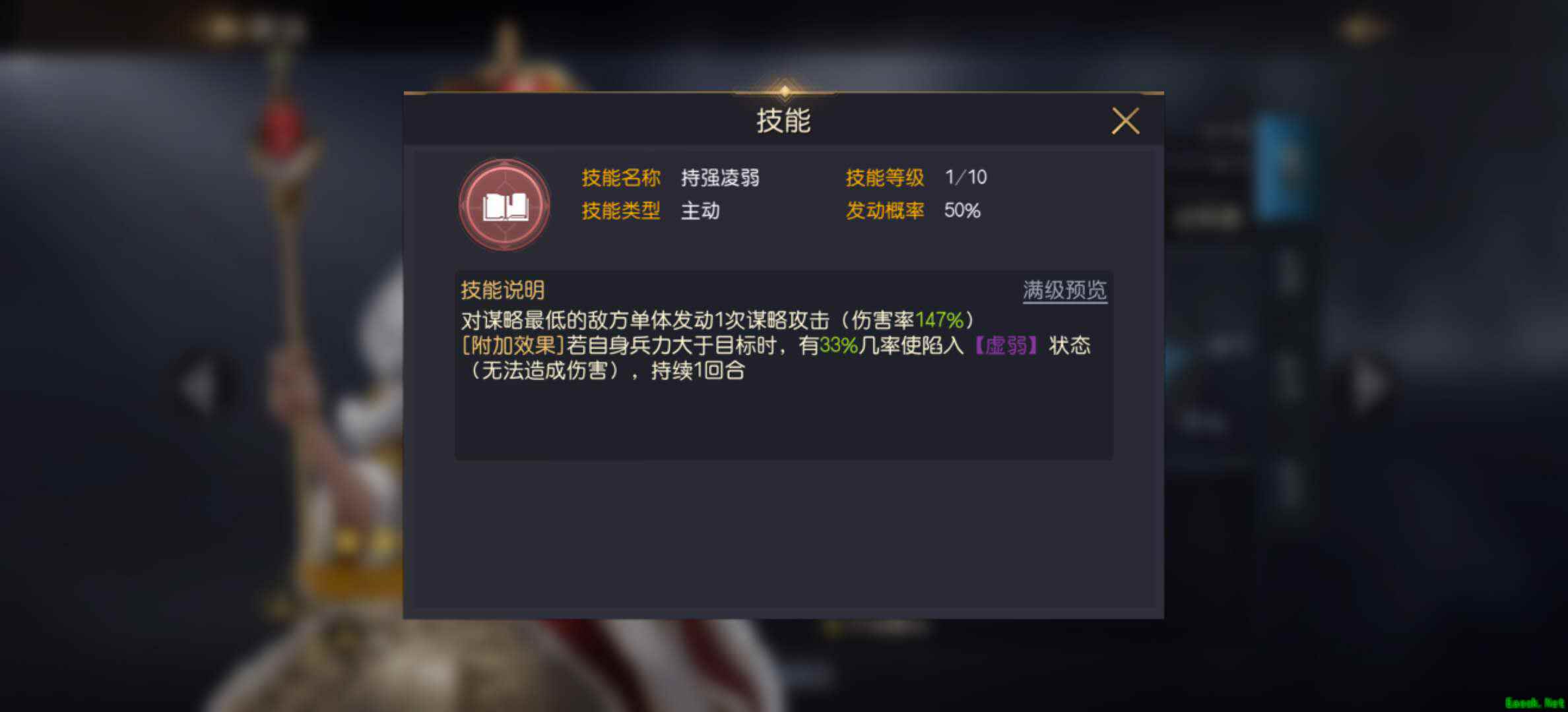 维多利亚女王自带技能为【持强凌弱】,能够对谋略最低的敌方单体发动一次谋略攻击(初始伤害率147%,满级237%),若自身兵力大于所攻击的目标兵力,则产生附加效果,有一定几率(初始33%,满级60%)使敌方陷入1回合的【虚弱】状态。需要注意的是,【持强凌弱】的触发几率为50%,并且不会随技能等级提升而提升。