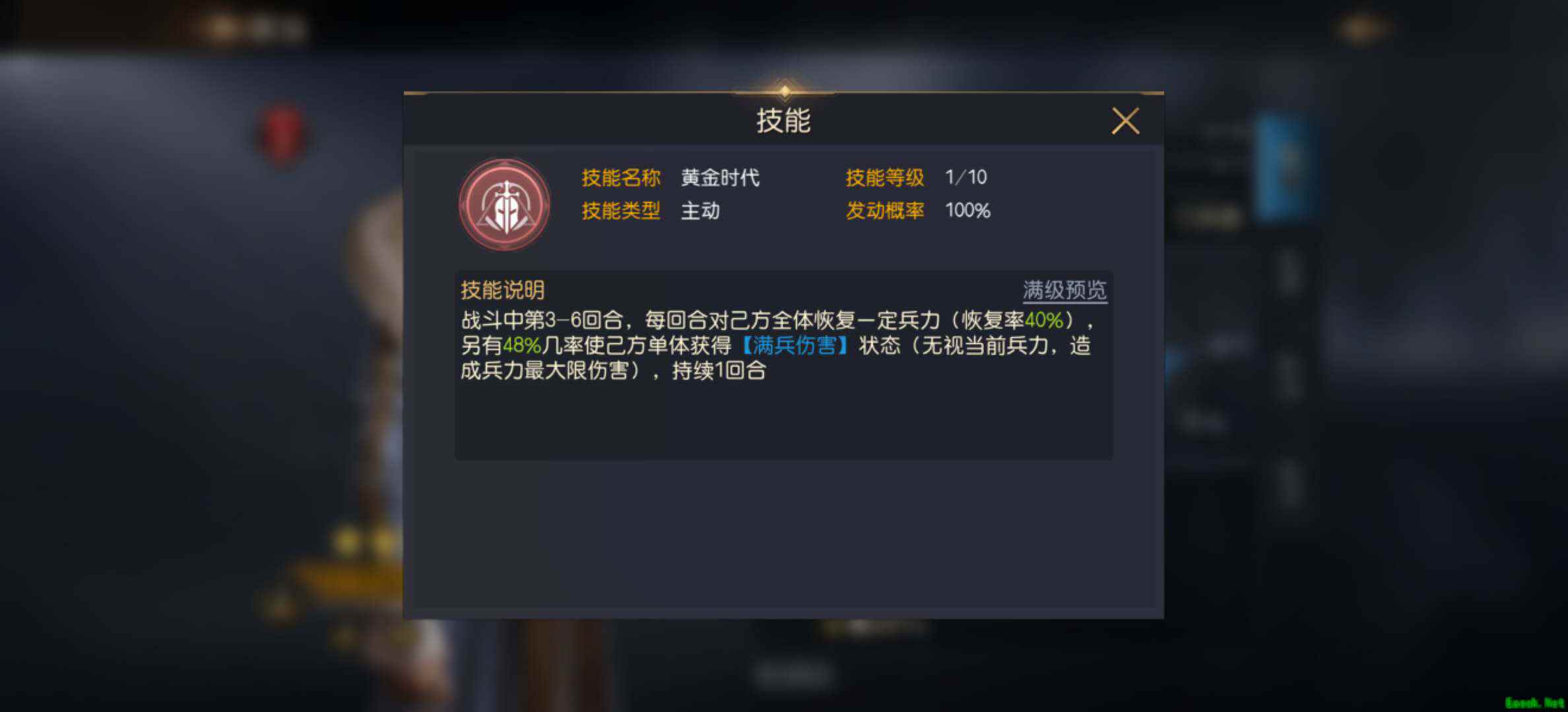 伊丽莎白的自带技能为【黄金时代】,能够在战斗中的3-6回合对己方全体恢复(初始40%,满级67%)一定兵力,并且有一定概率(初始48%,满级45%)使己方单体获得1回合的【满兵伤害】。可见,此技能在恢复兵力之余,还能够概率为主将的输出能力提升到满状态水平。