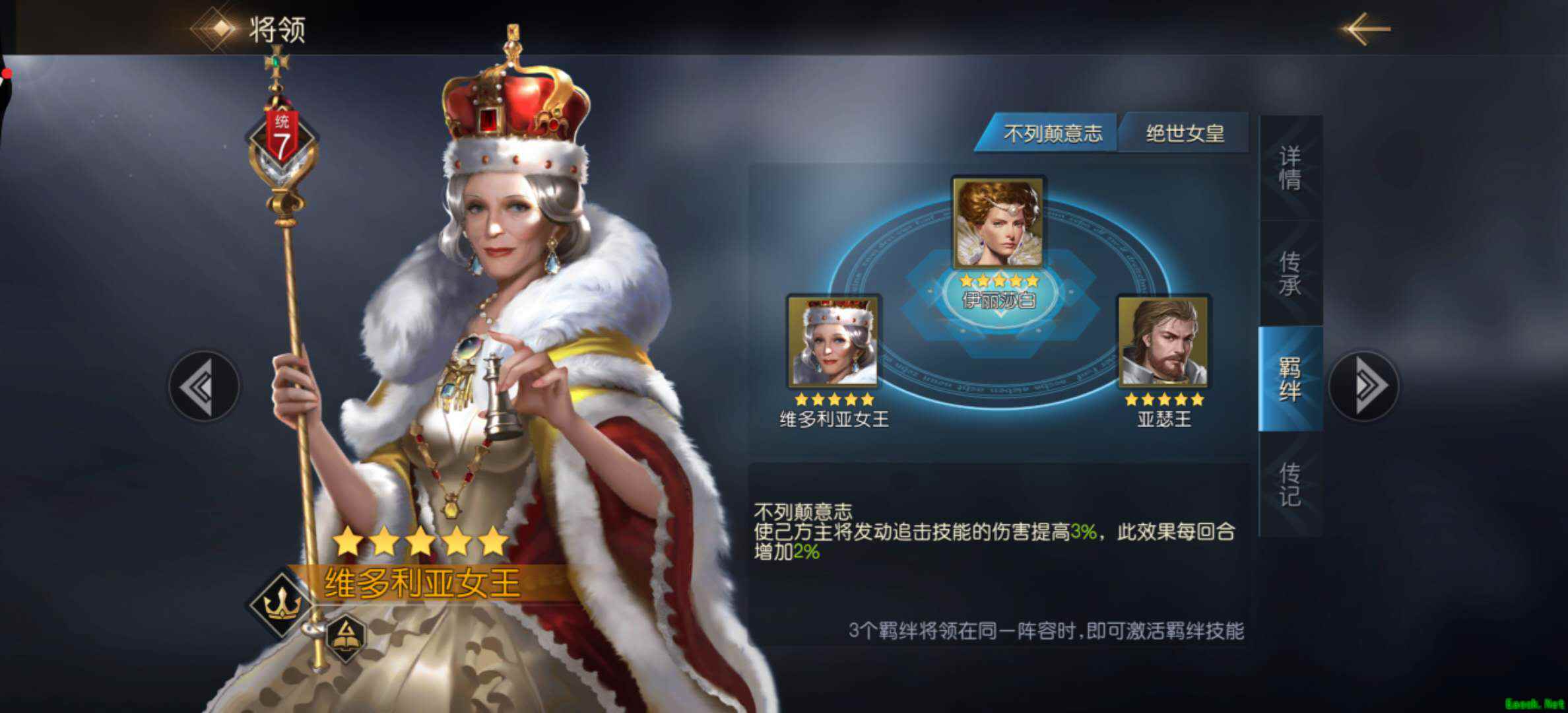 另外,维多利亚女王+亚瑟王+伊丽莎白能够激活【不列颠意志】羁绊,可以使主将发动追击技能的伤害提高3%,并且此效果每回合提高2%,这可以在一定程度上弥补阵容只有一个主力输出位置的不足。