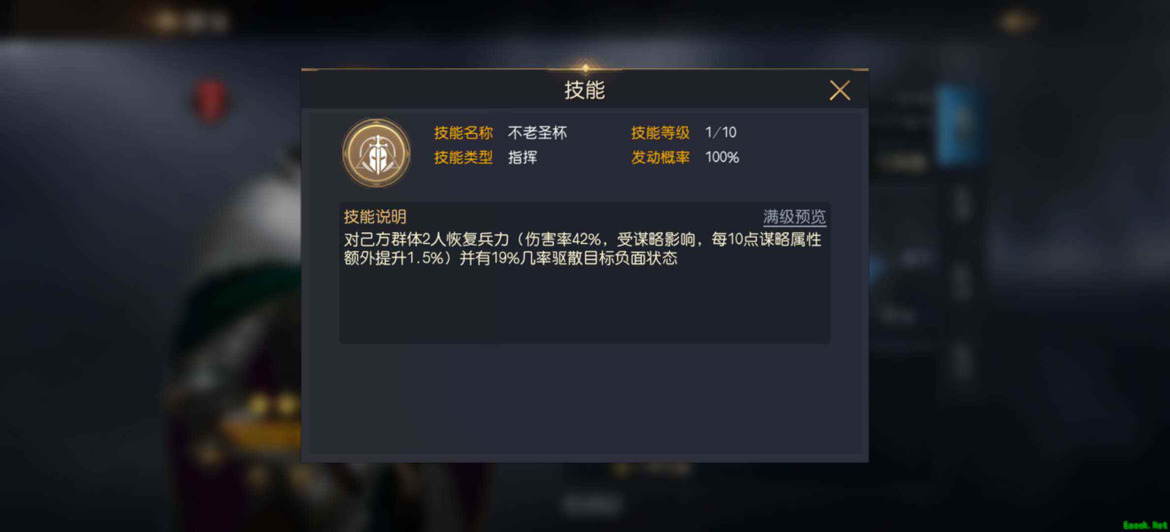 亚瑟王的自带技能为【不老圣杯】,能够为己方群体2人恢复兵力(初始42%,满级69%,每10点谋略额外提升1.5%),并有一定几率(初始19%,满级37%)驱散目标的负面状态。可见,此技能主要为辅助效果,为队伍提供治疗和解除负面效果。