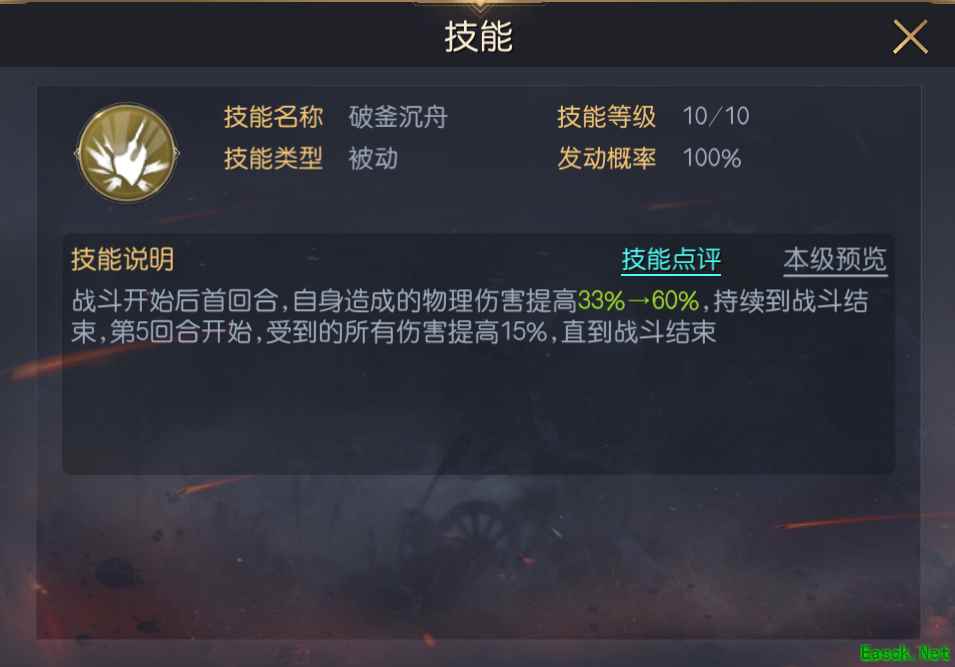 项羽的自带技能【破釜沉舟】,是一个百分百概率发动的被动技能,可以给自身一个伤害提升33%的增益效果,满级达到60%,该效果全程有效。但从第五个回合开始,项羽受到的所有伤害会提升15%,直到战斗结束。