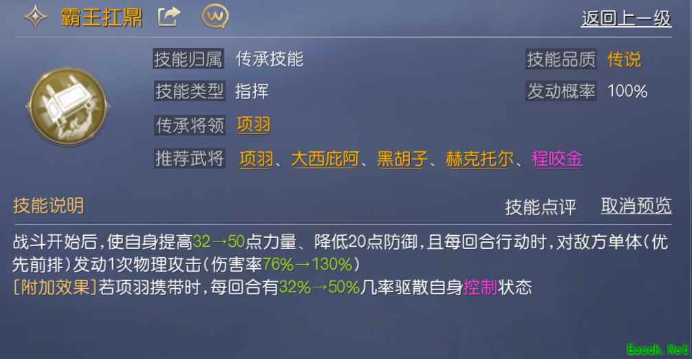 【霸王扛鼎】这个技能完美契合项羽,不仅有50的力量提升,每回合行动时都可发动1次物理攻击,最重要的是每回合都有概率驱散【控制】效果,极大的提升了项羽的输出效率,虽然会降低自己20点防御,但性价比非常高。