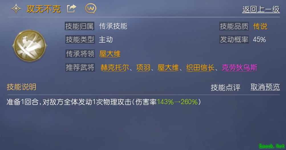 【攻无不克】没有额外效果,但发动后可造成260%的全体伤害,配合上项羽高额的力量属性与物伤加成,最终的实际伤害会远远超过这个数值,用于爆发最好不过。