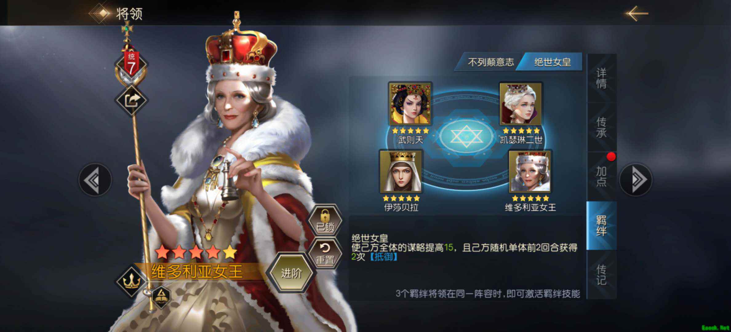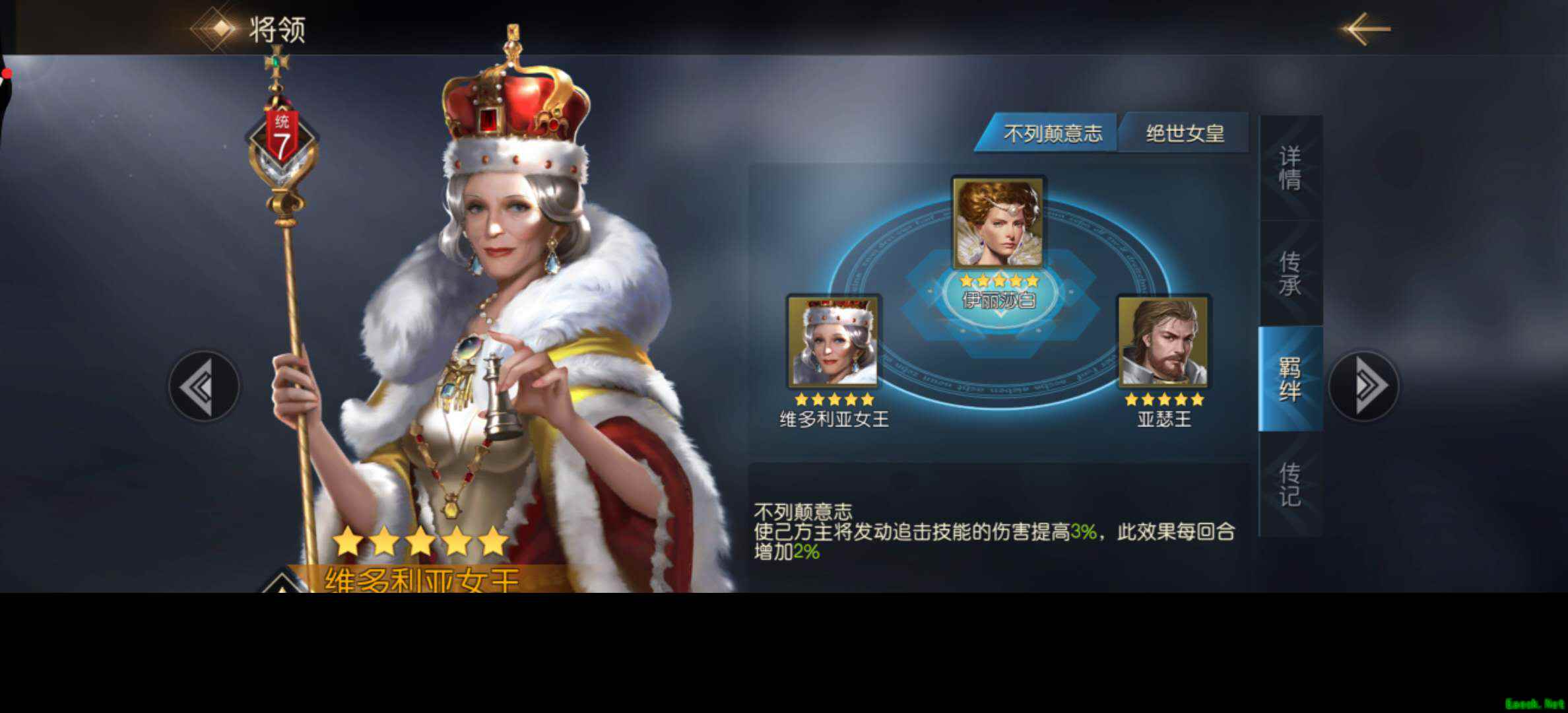 推荐羁绊1:维多利亚女王+伊丽莎白+亚瑟王,触发【不列颠意志】羁绊,能够使己方主将发动追击技能时的伤害提高3%,且每回合增加2%。需要注意的是,这三个将领的自带技能均不是追击技能,所以此羁绊需要至少为队伍主将学习1个谋略输出型追击技能。