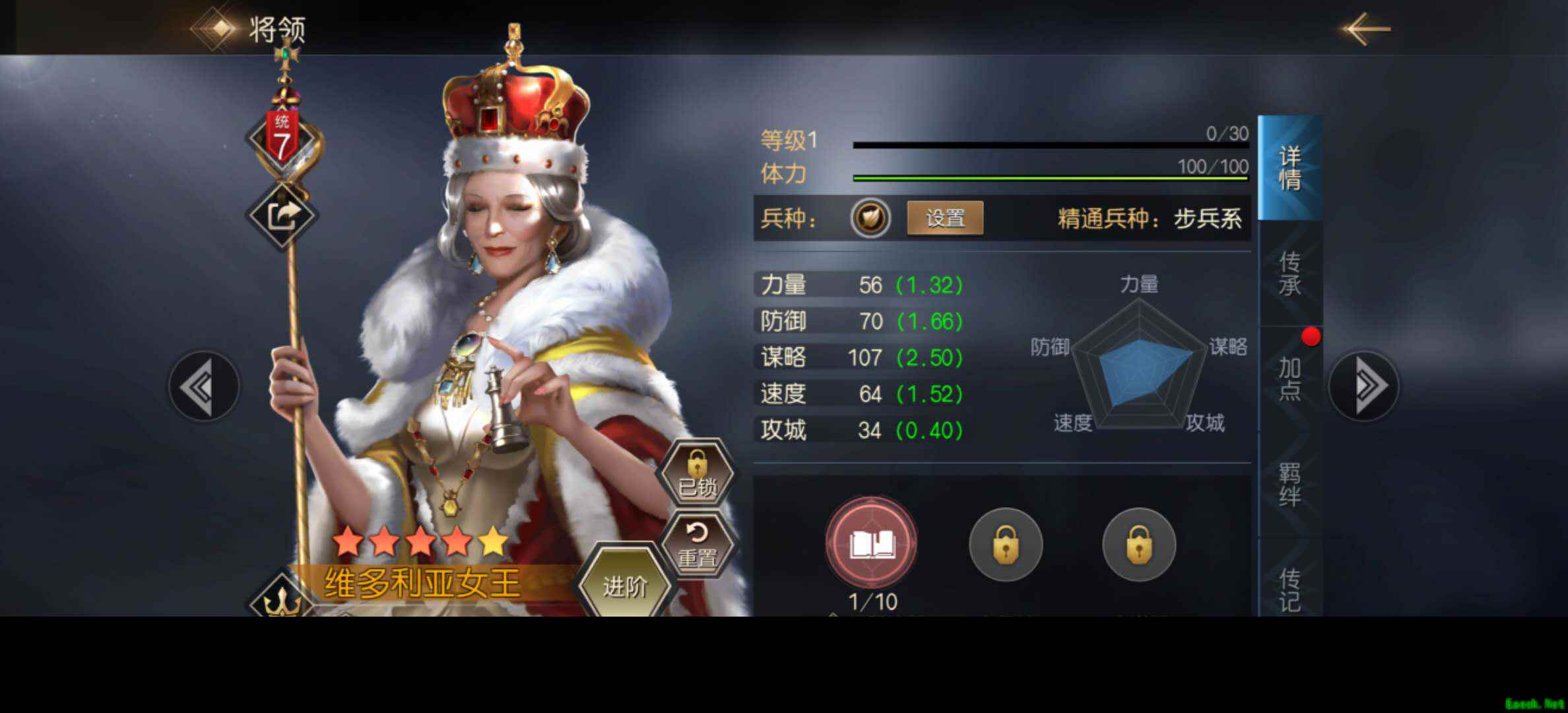 在游戏中,除了有力量属性超群的物理输出型将领外,还有谋略属性主导的谋略输出型将领,二者均为队伍中的输出主力军。下面给大家带来西洋阵营中的5星将领维多利亚女王的全面分析。