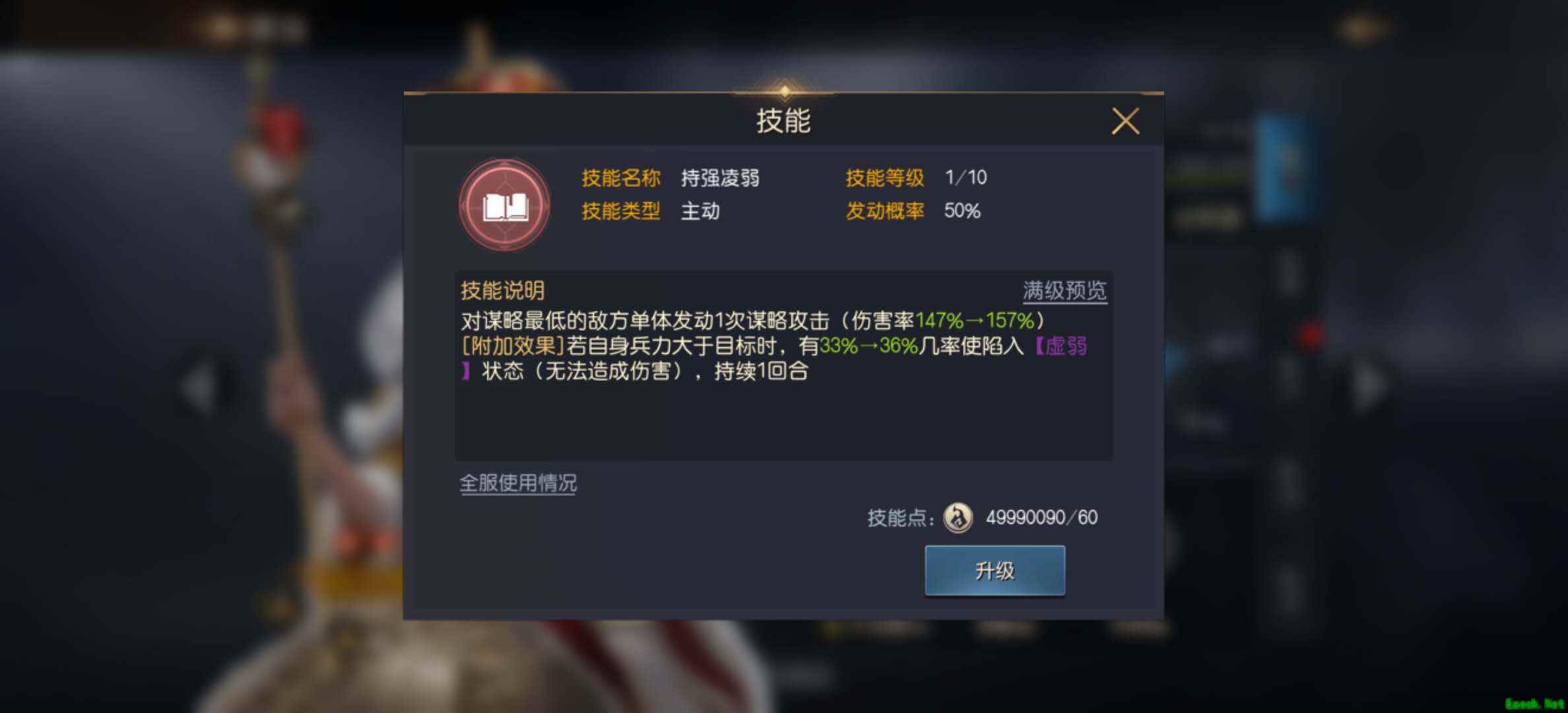 维多利亚女王的自带技能为【持强凌弱】,属于主动技能,能够以50%的几率对敌方谋略最低的单体发动一次较高伤害率(初始147%,满级237%)的谋略攻击,且技能附加效果为当自身兵力大于目标时,可以以一定几率(初始33%,满级60%)使其陷入1回合的【虚弱】状态。可以看出,【持强凌弱】技能对于一些谋略属性较低的物理输出型将领有着十分显著的克制效果,能够对其造成大量的伤害。考虑到技能的附加效果需要对比兵力,为了保证技能能够发挥效果,建议在敌方兵力损失后再使用维多利亚女王,例如攻占土地时作为第二部队。