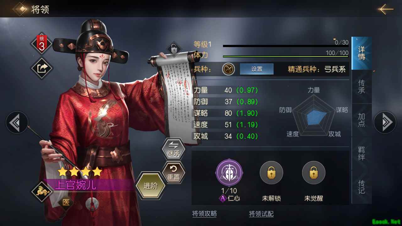 上官婉拥有强大的治疗能力,其自带技能可以在前4回合对己方兵力最少的将领进行治疗,增加了队伍的生存能力。技能搭配上我推荐【止殇】+【激励】,增加谋略输出的同时也进一步略微强化了恢复能力。