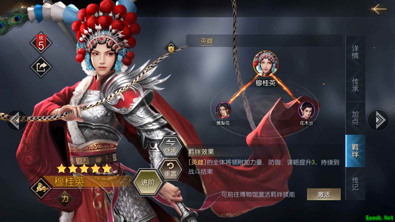 穆桂英和樊梨花和花木兰具备【英雌】羁绊(全体将领附加力量、防御、谋略提升3,持续到战斗结束),集齐这三个英雄即可在博物馆中激活羁绊,为这三个英雄获得被动属性加成。除了穆桂英以外其余将领都为4星将领,将为容易获得。