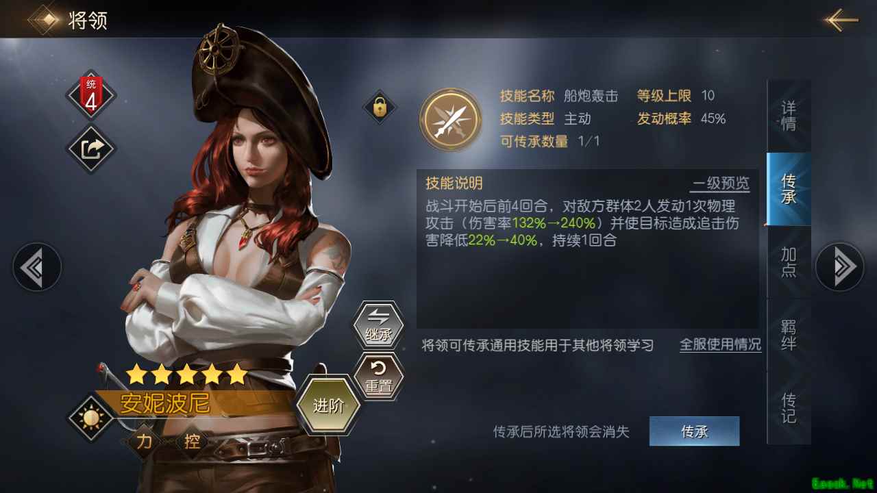 对于第二个技能的选择,则需要根据自身的情况以及穆桂英的将领特点进行选择学习。当穆桂英到达5级之后,可以通过传承其他将领的技能使得自身学习到第二个技能。考虑到穆桂英在力量属性方面比较强势,这里推荐大家选择能够进一步提升穆桂英攻击能力的技能进行传承。例如,【船炮轰击】(安妮波尼传承)技能能够在战斗开始后前4回合,对敌方群体2人发动1次物理攻击(伤害率132%)并使目标造成追击伤害降低22%,持续1回合。除了【船炮轰击】之外,还有【啖睛威慑】(夏侯惇传承)、【以战养战】(薛仁贵传承)、【万人敌】(列奥尼达传承)等技能都很适合穆桂英。