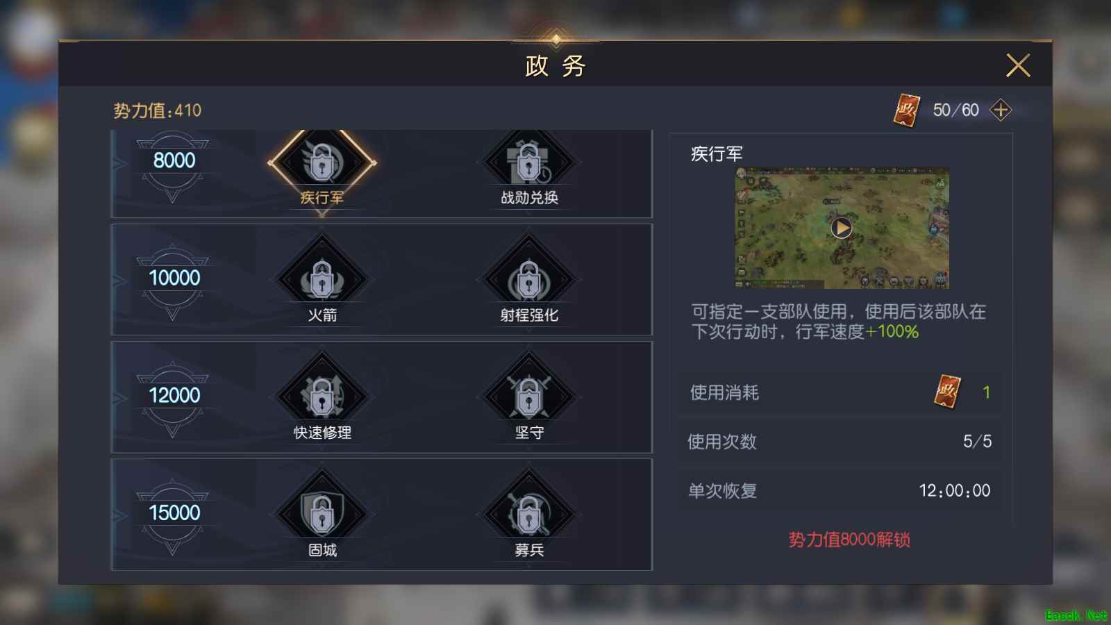 政令是政务玩法的基础物资,在政务系统中我们可以进行多种政务行动,比如恢复部队体力,在资源地建立营田所,行军途中强征当地粮草等等行动,是游戏中沙盘玩法里最重要的货币。