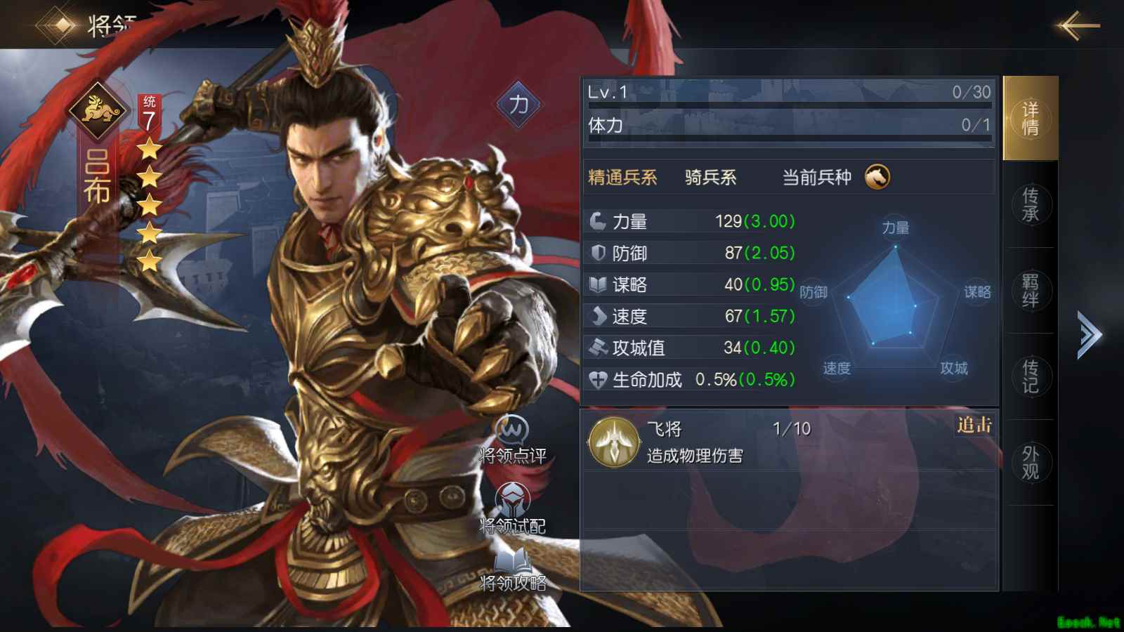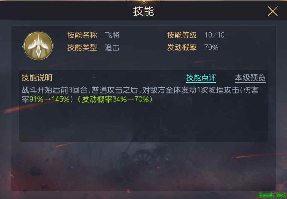 吕布一直是游戏中的武力担当,其追击技能【飞将】可在进行普通攻击之后触发额外伤害,可以针对敌方全体发动1次物理攻击,升至满级之后的AOE伤害非常高,发动几率也高达70%,是一个高伤且稳定的AOE输出技能。
