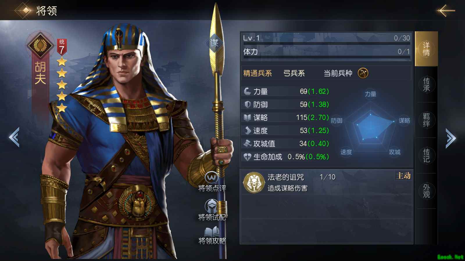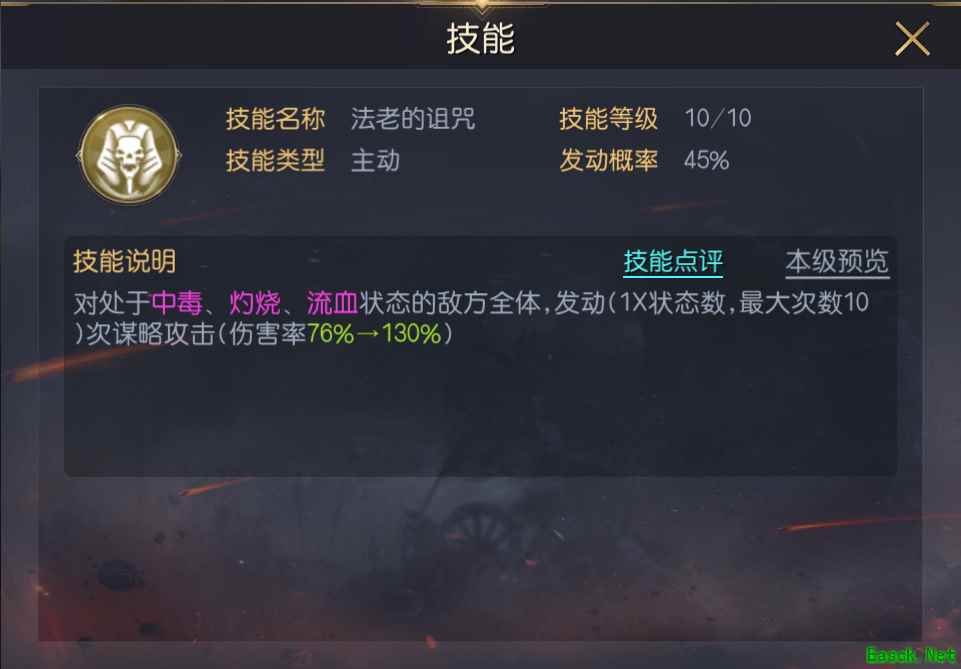 胡夫是一个比较另类的输出C位,【法老的诅咒】是通过敌方所处的中毒、灼烧、流血状态的状态数目,从而对敌方全体发动对应次数的谋略攻击,理想情况下能造成高达1300%。所以胡夫想发挥该技能的实际效果,就需要搭配一些能造成这三类负面状态的技能或是队友。