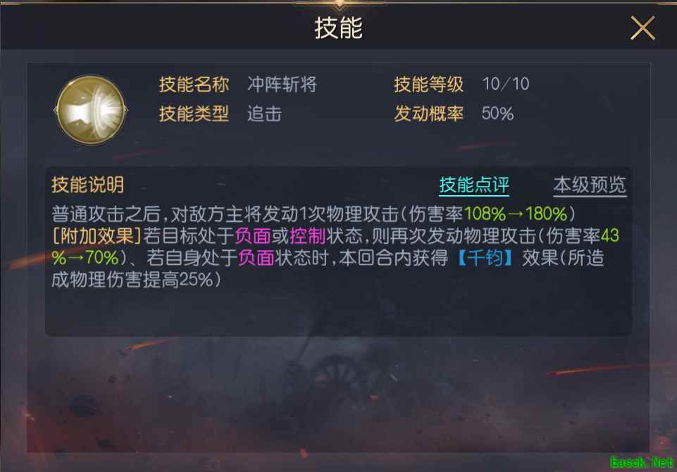 秦琼的技能【冲阵斩将】基础伤害率不高,但是可以直接攻击敌方主将,搭配上能触发连击的技能,可让他每回合多次攻击敌方主将,无论是PVP还是PVE都有奇效。附加的效果与负面联动力较大,在满足条件后可进一步提升技能伤害。