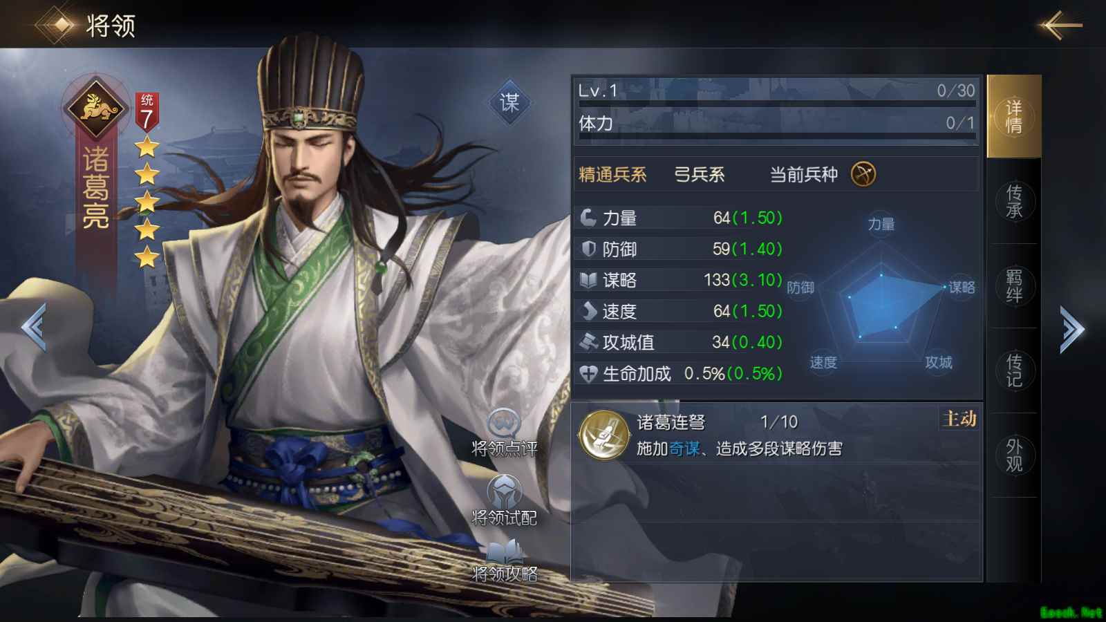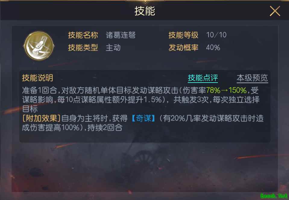 诸葛亮的技能【诸葛连弩】发动之后可以触发三次单体伤害,每次独立选择目标,总伤害率达到450%,配合他3.1的谋略成长能够打出高于面板水平的实际输出,诸葛亮作为主将时,技能发动还能获得20%【奇谋】效果,可提高其所有技能的爆发率。
