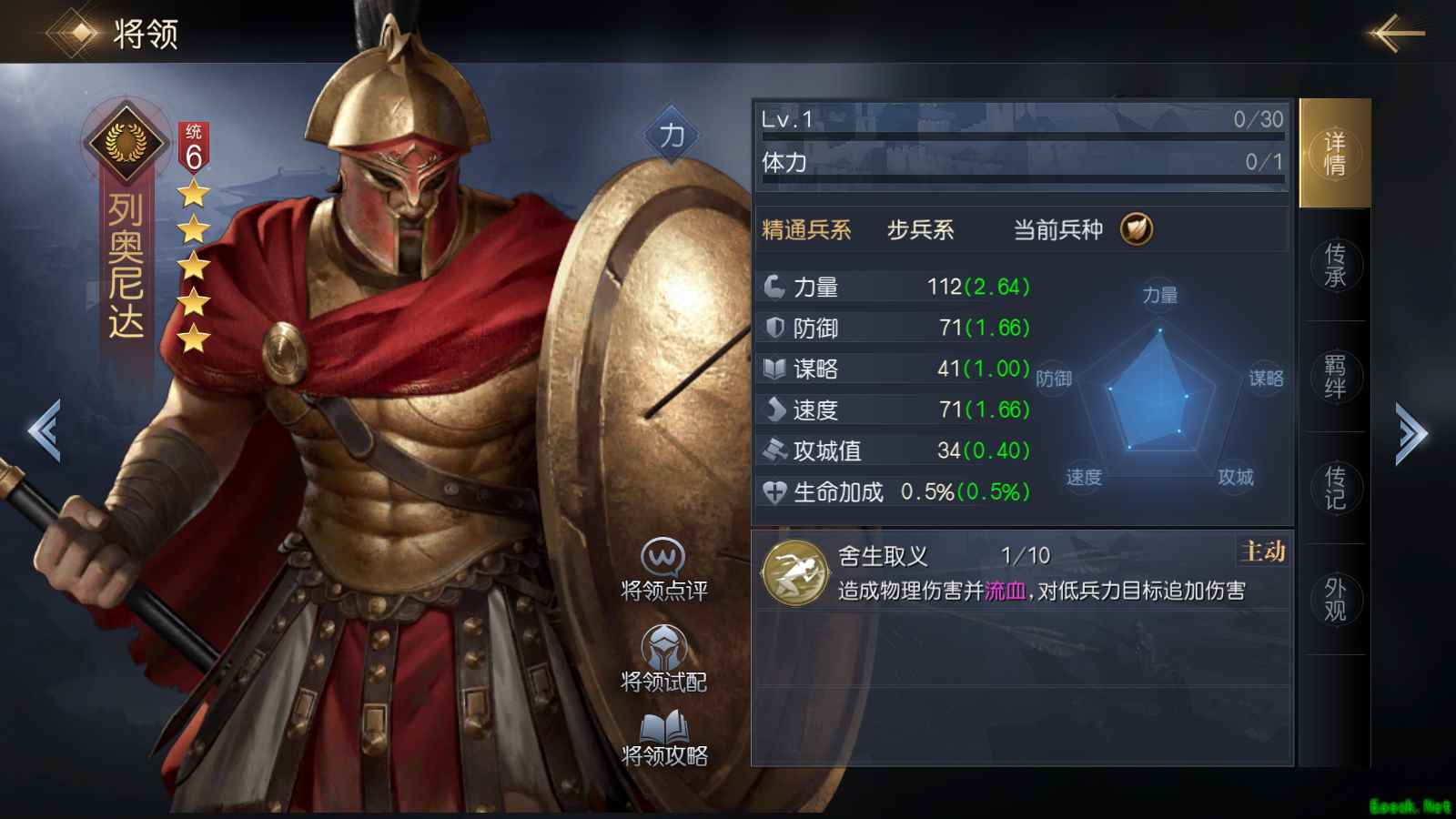 列奥尼达也拥有不错的力量属性,虽然其自带技能即时伤害仅有150%,但附加【流血】状态后能造成2回合的持续伤害。最强势的是【舍生取义】的附加效果:对兵力低于50%的目标,造成双倍伤害。通过这个效果,列奥尼达能搭配上爆发力优秀的将领,快速将敌人兵力压低,然后进行倍伤输出。