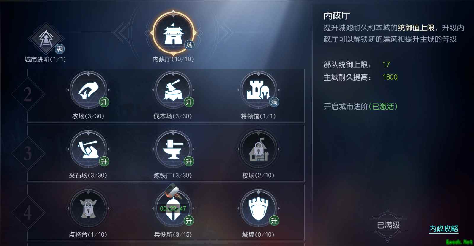 内政厅7级后就不用太着急升级内政厅,除非心仪的满编队因统御限制无法上阵,那么可以升到8级解锁统御厅。9、10级建筑中只有兵科学院与文明兵种有实用性,建议达到8级内政厅即可,到后期资源充足再考虑升级。