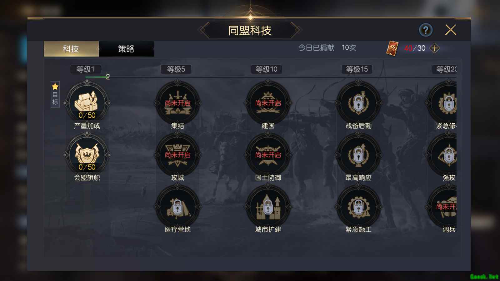 在介绍同盟科技和同盟策略之前,我们需要先来了解一下同盟科技和对应策略的获得途径。通过成员资源捐献的方式提升科技等级。个人势力值不同,每日单次捐献资源量不同,势力值越高单次捐献量越大。每日00:00刷新每日捐献,每日前10次捐献,每次捐献个人政令+1,同盟科技点+1。每日捐献10次后再次捐献将无法获得贡献度、政令、科技点,同时捐献科技及同盟经验获取按原效率1/100转化。