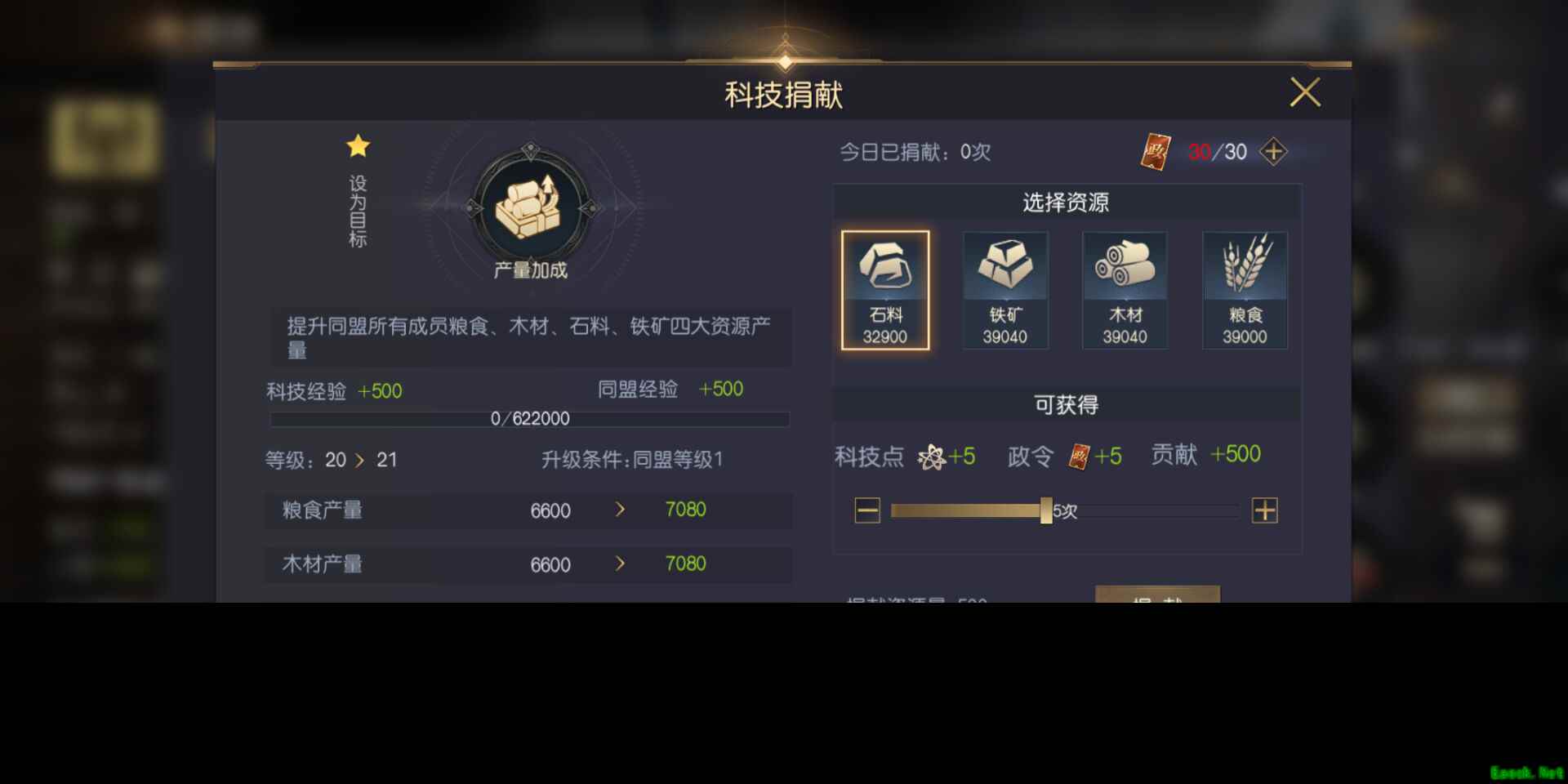 不同的同盟科技会随着同盟等级的提升逐渐开启,同盟等级每提升五级就会解锁新的同盟科技,之后同盟内玩家通过捐献资源,可以提升同盟科技。首先是资源产量提升科技,这一项科技在同盟对资源产量提升方面的加成占比还是很高的,也是同盟成立初期需要主要提升的科技。