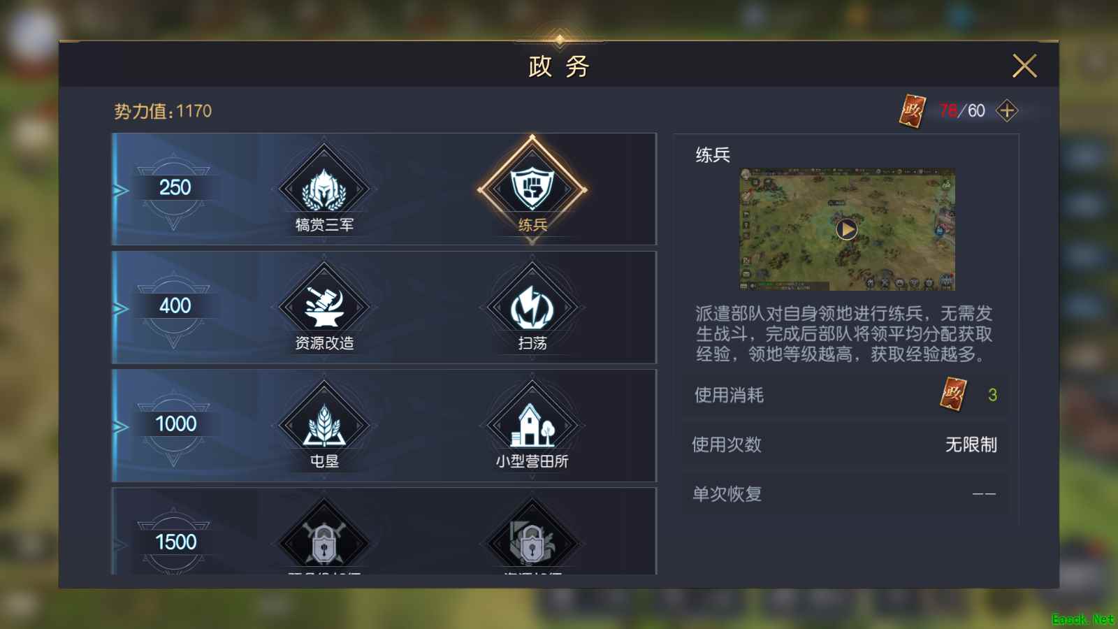 想要快速达到上述要求,我们可以结合自己的兵损情况去选择6级地或者7级地扫荡练级,同时不要吝啬银币,招募大量低星将领转化技能点提高将领技能,同时尽可能的组建同阵营队伍,保证搭配合理,提高对应的文明科技,升级部队器械、阵型,这些额外的加成都能显著提升部队的战斗力。