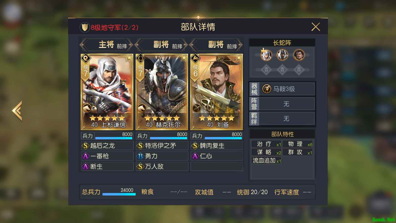 8级地部队数量提高到了24000*2,相比于7级地提高了整整6000的兵力,虽然都为全五星阵容,但8级地守军的将领属性、技能都强于7级地,且将领等级提高到了40级,而且技能等级也都来到了7+5+3这个水平,器械也得到升级。最主要的提升在于守军的搭配更合理,基本都为输出+前排或输出+治疗的配置。