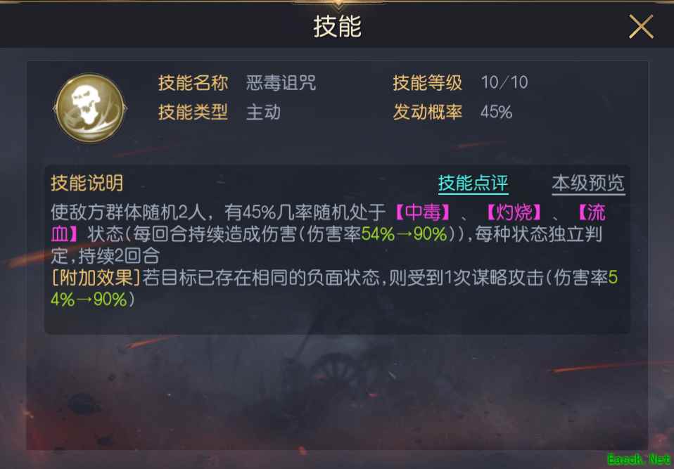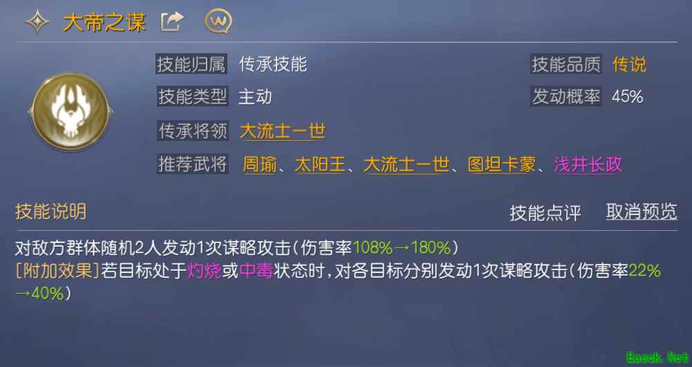 这两个技能都能对处于负面状态的敌人进行额外攻击或是额外状态施加,技能的自我联动性非常优秀,十分适合图坦卡蒙携带,另外平价四星技能也可以携带【耿谋】和【慷慨善战】这两个技能伤害都有不错的谋略加成,也有一定的控制效果,可以用来过渡。