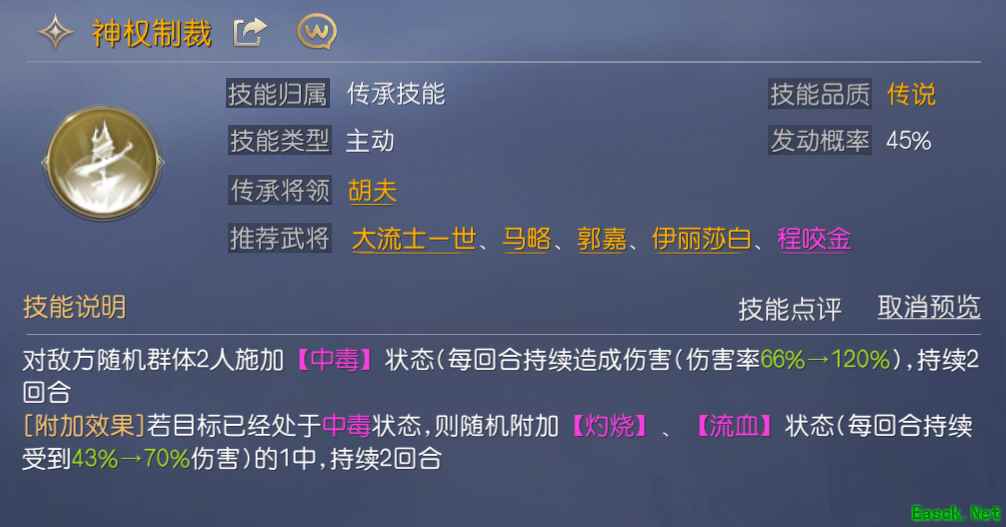 另外太阳神能够在敌人任一人处于【灼烧】的情况下,给敌方全体施加【灼烧】状态,扩大debuff的范围。同时,因为【灼烧】在此队伍中出现的概率相对较高,我们在给这三个将领搭配技能的时候也可以选择适配【灼烧】的技能,具体搭配推荐如图所示。