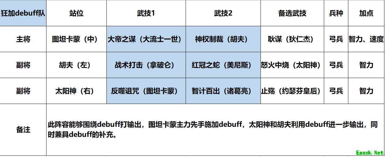 图坦卡蒙的自带技能可对2名敌人施加多种负面状态,能够更好地配合那些需要前置状态来打输出的将领。同时该技能在施加负面状态时,如果目标已经带有相同状态,还可以再次触发谋略伤害,整体输出率非常可观,所以其再加点的选择上,可以主加谋略,搭配少量的速度,将会发挥出很不错的效果。