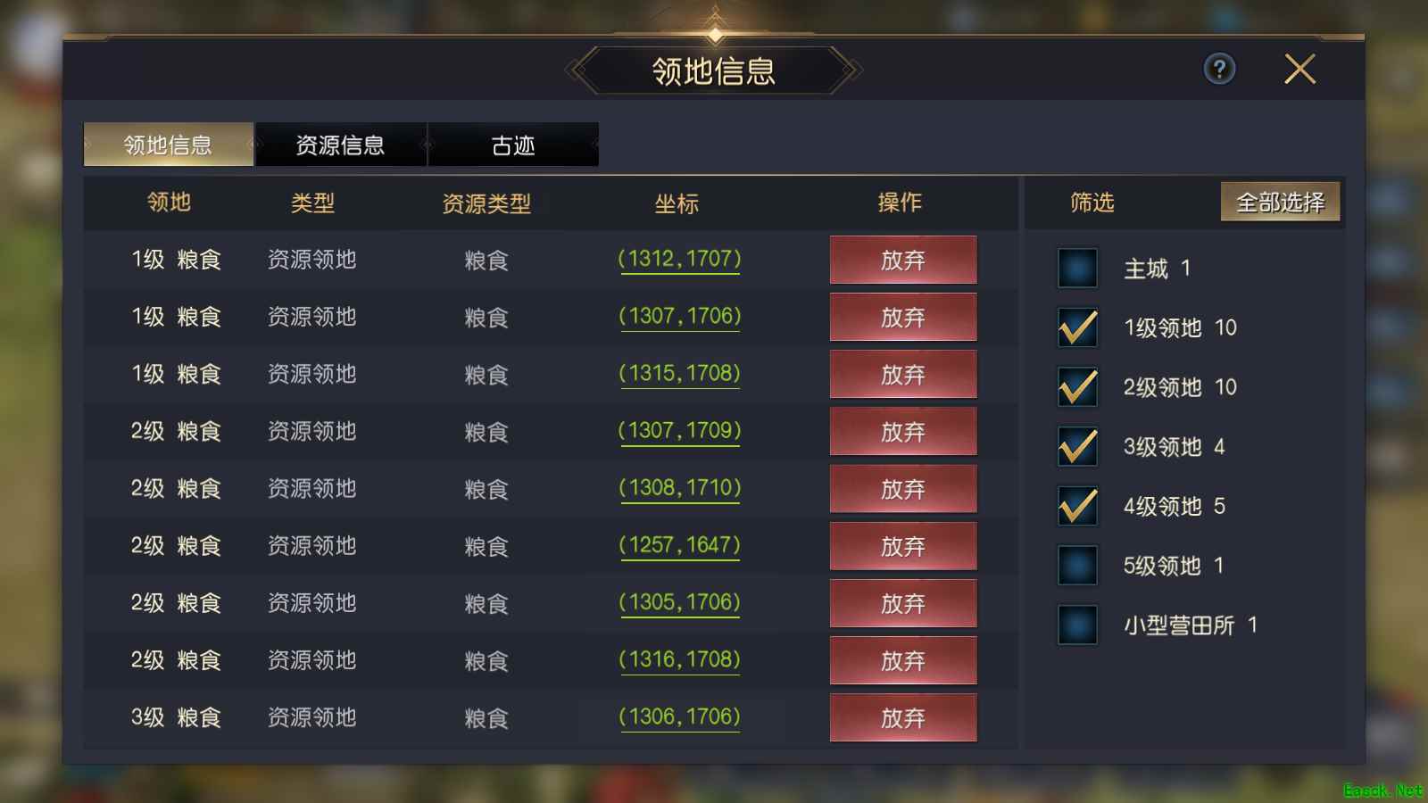 游戏中的土地类型有4种,但我们在开荒时应当对目标土地的类型有所选择,因为前期对于不同资源的需求量是不同的。一般来说,升级同一建筑所需要的石料比铁矿和木材要多得多,有些建筑甚至是两倍的关系,而对粮食几乎没有需求。因此在前期最好是将石料、铁矿、木材、粮食的产量配置为5:2:2:1。
