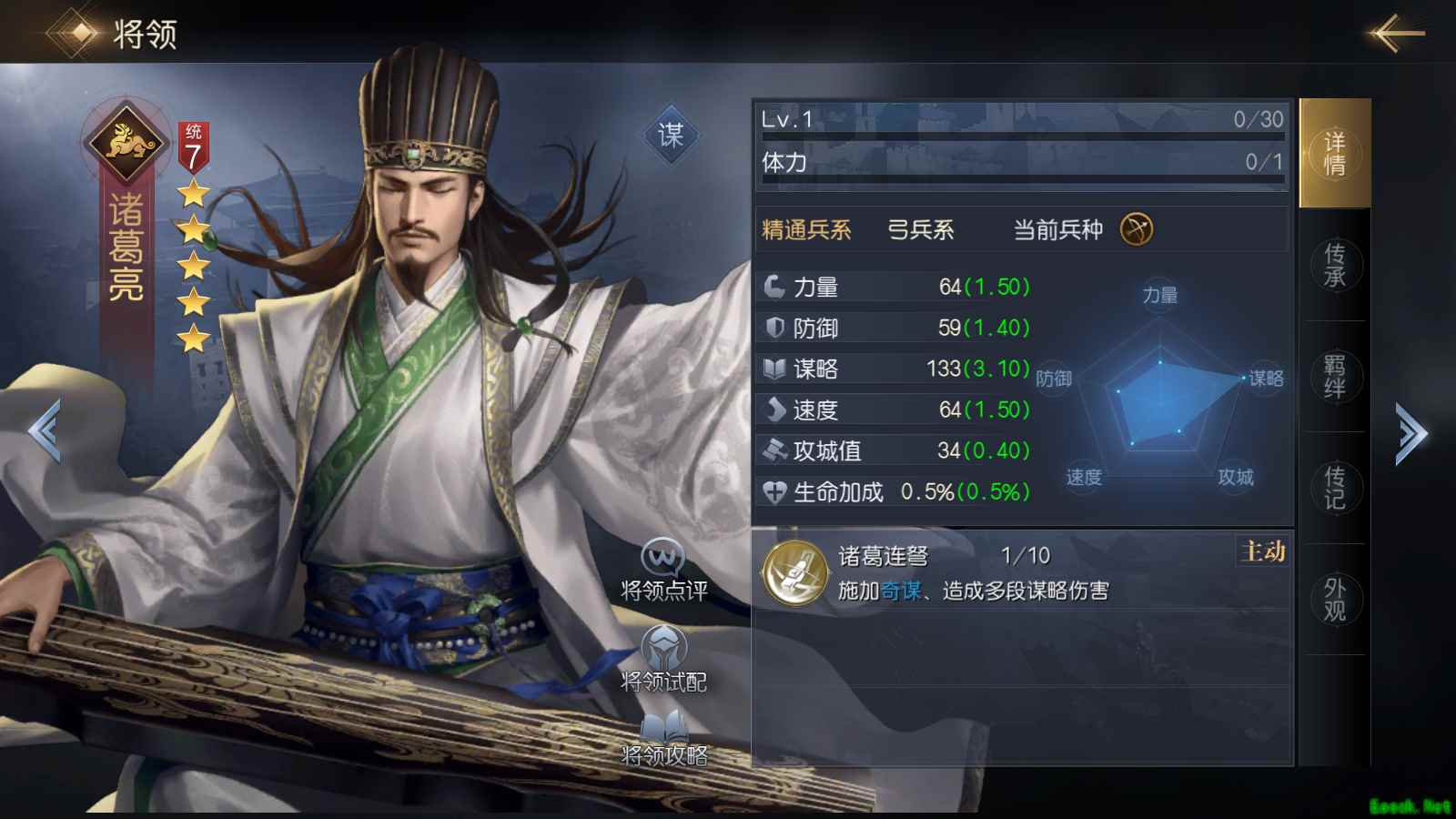 谋略型将领一般都拥有极高的谋略成长值,因此也就具备了极强的谋略输出能力,同样的,此类将领力量属性都不很高,因此普攻伤害也就很低。想要尽可能的发挥此类将领的威力,一般需要为他们搭配谋略属性加成的技能,进一步强化其输出能力。此类将领同样在队伍内担任主c或者副c的角色,最为典型的代表为李世民、诸葛亮和拿破仑等等。