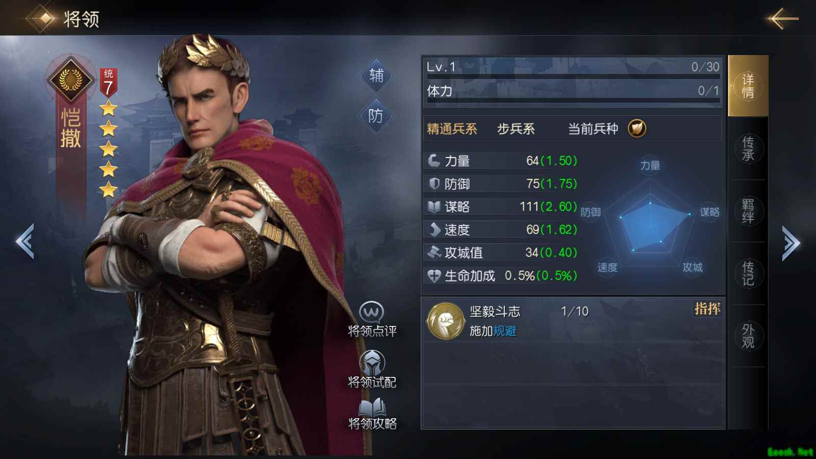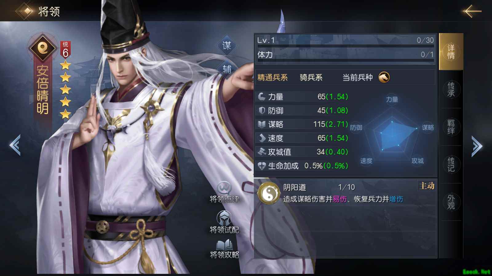 根据将领的特性,可以分为力量型、谋略型、辅助型、控制型、医疗型和防御型六大类,同一个将领可以同时属于不同的类型。