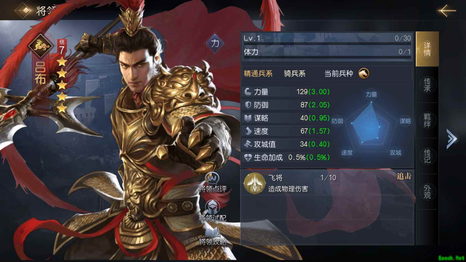力量型将领一般都拥有极高的力量成长值,因此也就具备了极强的物理输出能力,但此类将领一般谋略属性都不很高。因此,想要让此类将领发挥出最大的威力,一般需要为他们搭配一些力量属性加成的技能,进一步强化其输出能力。此类将领一般在队内担任主c或者副c的角色,最为典型的代表为吕布、成吉思汗和宫本武藏等。