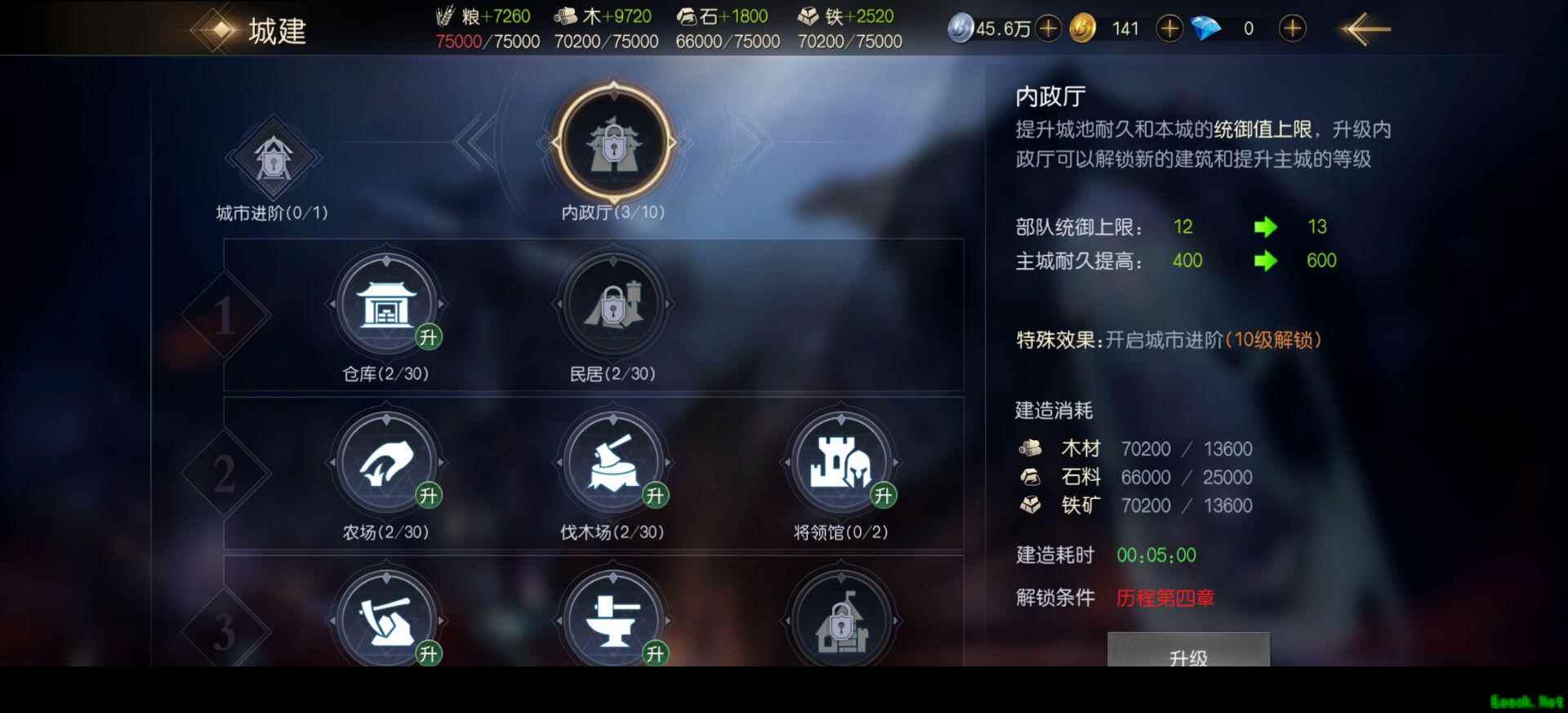 城建提升资源产量主要分为两个方面:一是提升内政厅的等级,从而直接提升主城资源产量;二是提升农场、伐木场、采石场、炼铁厂等级,从而提升对应资源产量。