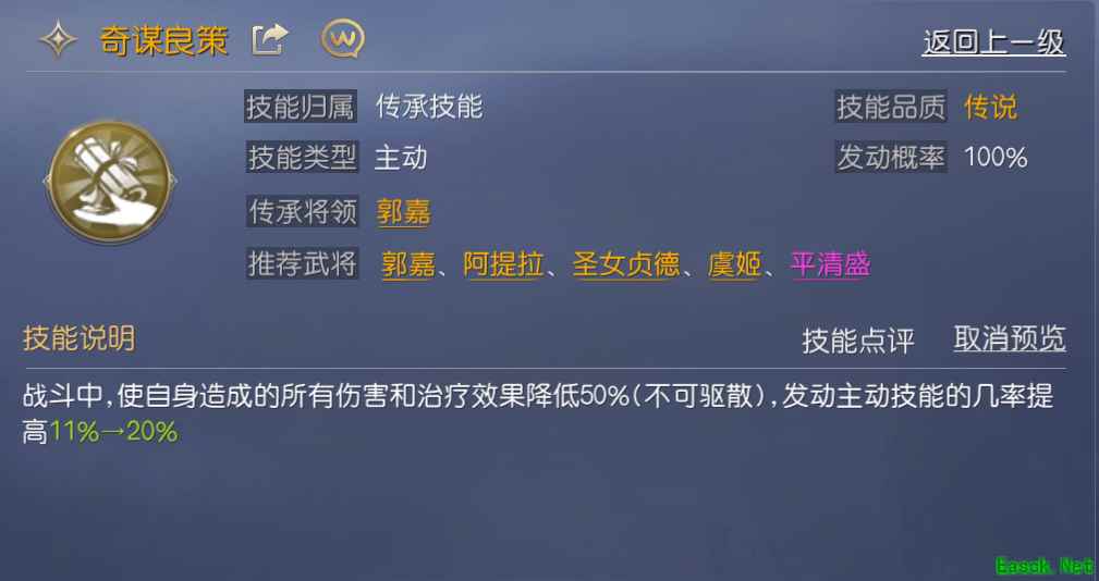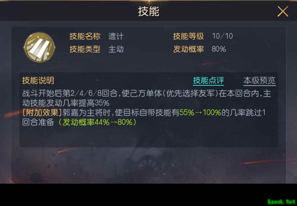 【郭嘉】自带技能【遗计】在战斗开始后的第2、4、6、8回合,使己方单体(优先选择友军)在本回合内,主动技能发动几率提高35%;【附加效果】自身为主将时,额外使该单体自带技能有几率(初始55%,满级100%)跳过1回合准备。