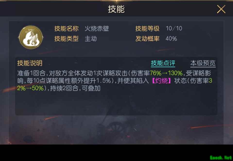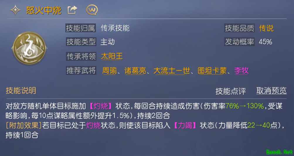 周瑜自带技能可造成全体【灼烧】,而【怒火中烧】可对已处于灼烧状态的敌人施加【力竭】,最高可降低40点力量值,配合自带技能可对物理队有一定克制能力,并且能提供不错的持续伤害。