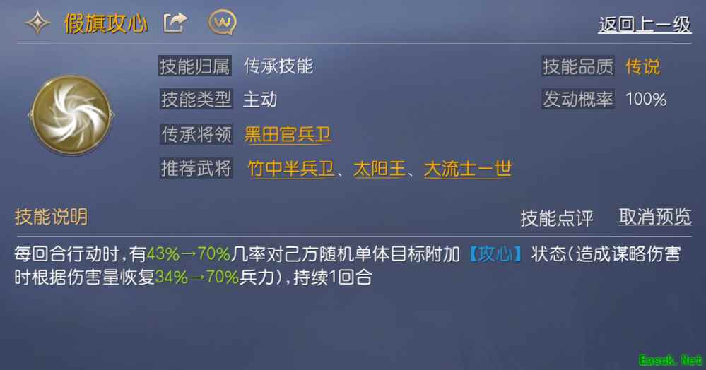 三技能搭配【假旗攻心】,由于奇谋良策的负面影响,由郭嘉来提供治疗会降低治疗量所以该技能的【攻心】效果正好用于提升队伍续航,让输出位自行回血。