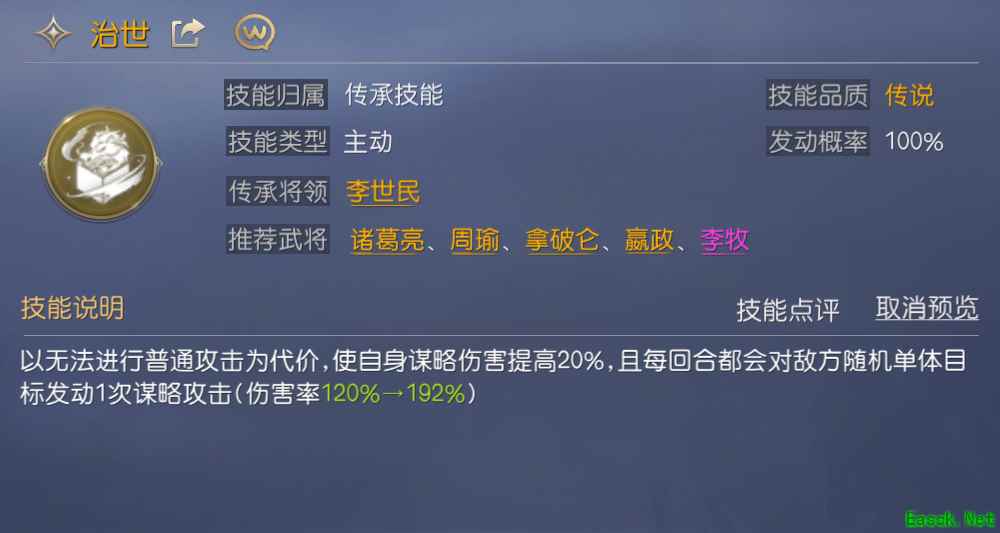 另一个技能推荐治世,该技能会让诸葛亮放弃普攻,转而获得每回合稳定的一次单体谋略输出,并能让自己所有谋略伤害提高20%,作为以主动技能攻击为主的诸葛亮并不需要普攻来触发技能,所以这个代价完全可以接受。