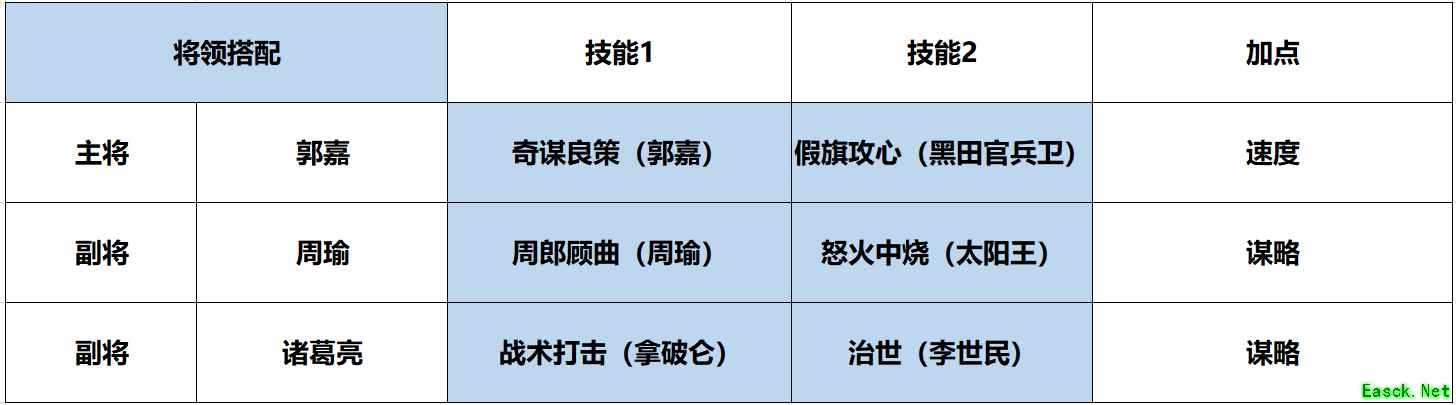 这套阵容是郭嘉作为主将,诸葛亮、周瑜为副将组成的,这三个都是五星将领,拥有极高的谋略属性以及谋略成长属性,三人配合后能极大的提升技能的释放效率。