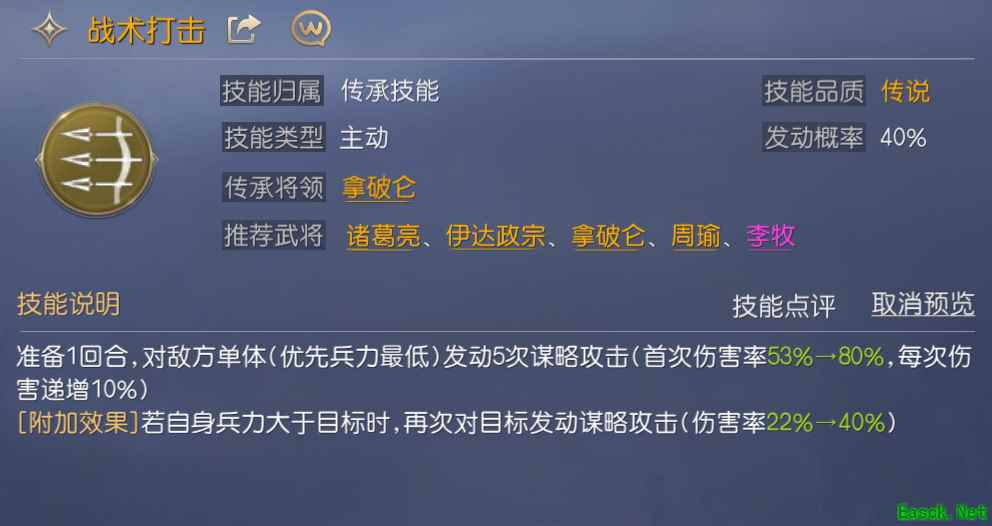 因为【诸葛连弩】可以靠郭嘉来优化发动效率,所以不用搭配智计百出,而是搭配一些补充输出能力的技能,如【战术打击】,该技能在发动后可造成5段谋略伤害,并根据兵力来判定额外伤害,配合诸葛连弩的多段伤害非常有效。