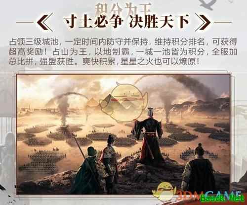 活动期间,玩家们以同盟为作战单位占领三级城池,在一定时间内防守并保持,维持积分排名,可获得超高奖励!占山为王,以地制霸,一城一池皆为积分,全服加总比拼,强盟获胜。