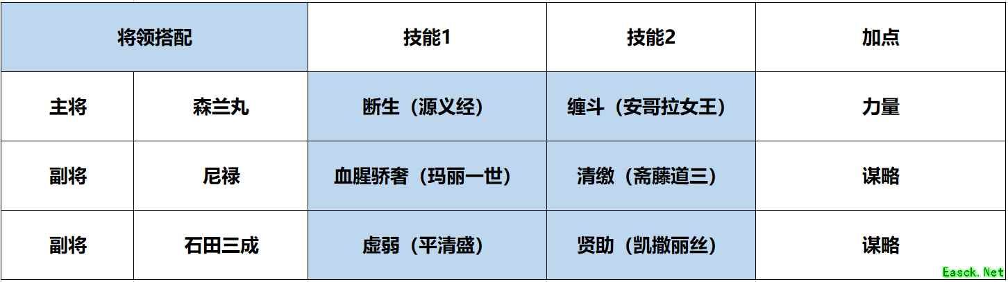 这里推荐的阵容如上图所示,队伍搭配的输出将领为森兰丸,在前期获取难度低,且物理输出能力较强。搭配的辅助将领为石田三成,其技能能够有一定概率对敌方造成控制效果,且能够对己方将领进行兵力恢复。队伍兼具物理输出和谋略输出能力,战斗能力较强。
