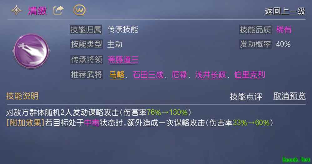 清缴能造成更多的群体谋略伤害,在攻击处于中毒状态的敌人时还可造成额外谋略攻击,配合血腥骄奢的中毒附加效果非常合适,只要两个技能都发动,至少有一名敌人会触发额外攻击。