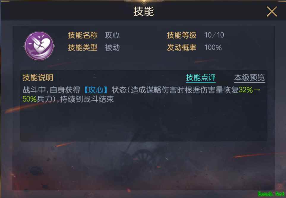 尼禄的自带技能为【攻心】,属于被动型技能,可在战斗中让尼禄全程获得【攻心】状态,能够在对敌方造成谋略伤害的时候,根据伤害量恢复一定比例的兵力,高达50%的恢复比例很好的提升了尼禄的续航能力,但这个技能的特殊之处在于,只有造成谋略伤害时才有兵力恢复效果,这也是他主选谋略属性的原因,