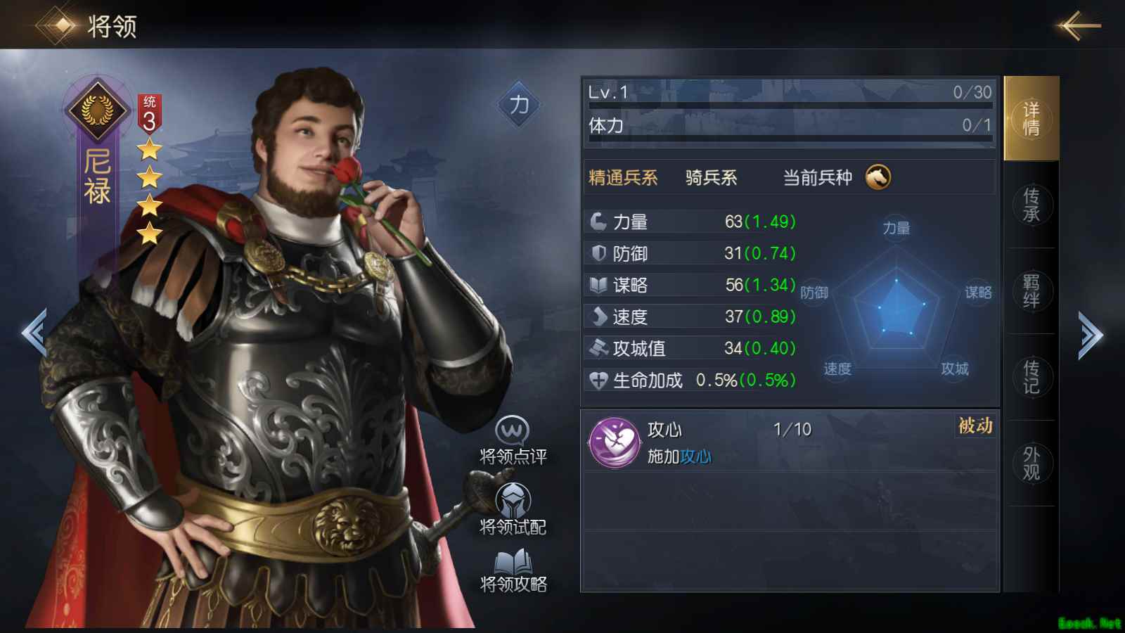 尼禄是游戏中古典阵营的一名4星级物理输出型将领,统御值为3,精通兵种为骑兵系,尼禄拥有不错的力量属性与谋略属性双成长,但其速度值较低,可以搭配一些混伤技能,尼禄的其他三项属性仅处于一般水平,但好在其技能具有兵力恢复能力,一定程度上弥补了尼禄防御较低的缺点。因为技能只靠谋略伤恢复兵力,这里推荐小伙伴们加点的时候主加谋略属性。